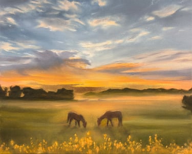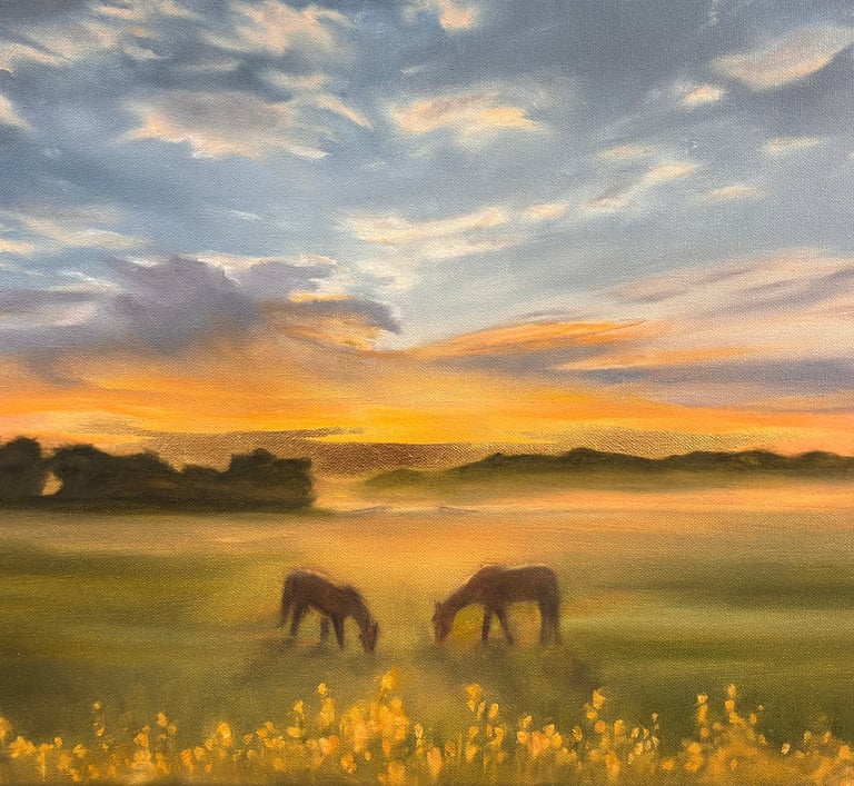A folyamat elején általában Photoshopban készítek egy alapkompozíciót – például egy általad választott égboltot egy másik tájjal kombinálva. Ez csak kiindulópont, hiszen a végleges festmény a saját stílusomban, organikusan formálódik ebből a koncepcióból. Miután jóváhagytad az előzetes vázlatot, elkezdem a festést. Az elkészítéshez általában 1–2 hét szükséges (+ 1 hét száradás).